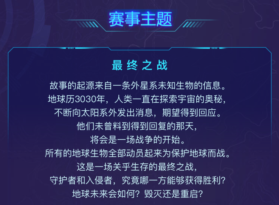 本次大赛以“最终之战”为主题关键词,分2D角色/2D场景/3D角色/3D场景/动作/特效/UI共七大专业向命题,同学们可以选择自己擅长的专业赛题进行参赛。